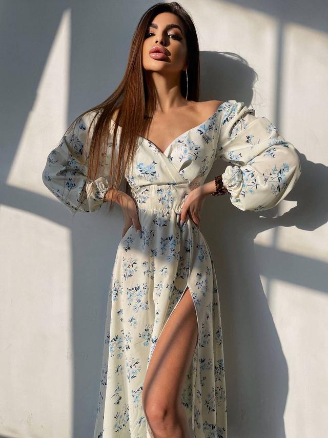 Показати оптові ціниКвіткова міді сукня з розрізом на спідниці та верхом на запах (р. 42, 44) 66035110Е