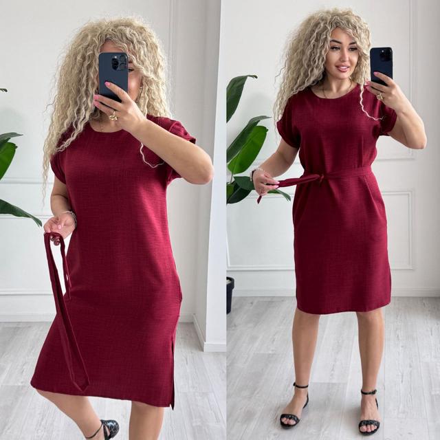 Жіноче плаття міді вільного крою з поясом і короткими рукавами (р. 42-52)