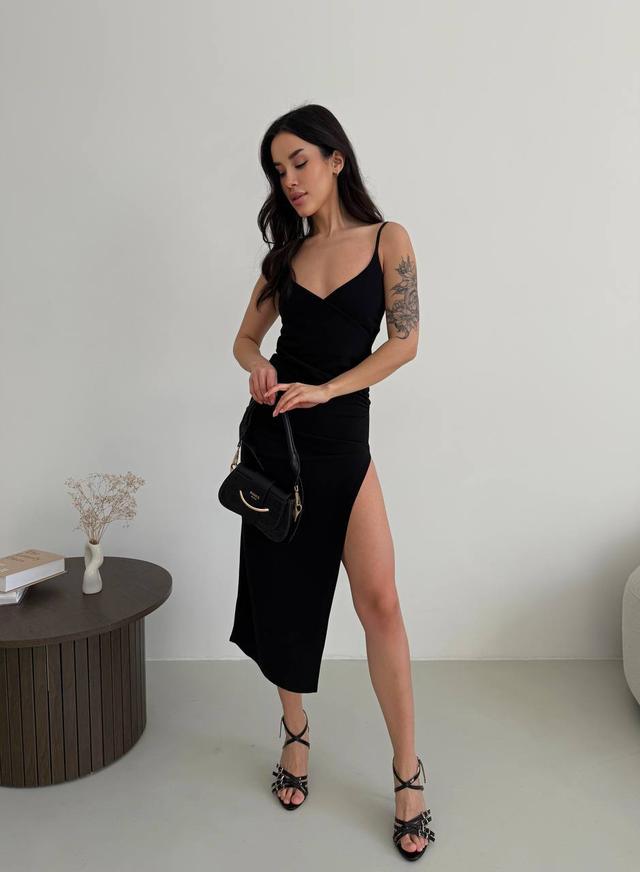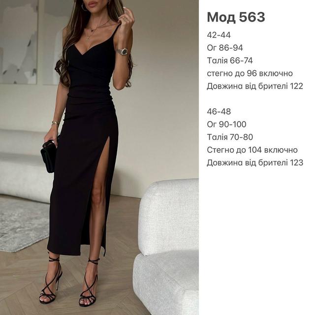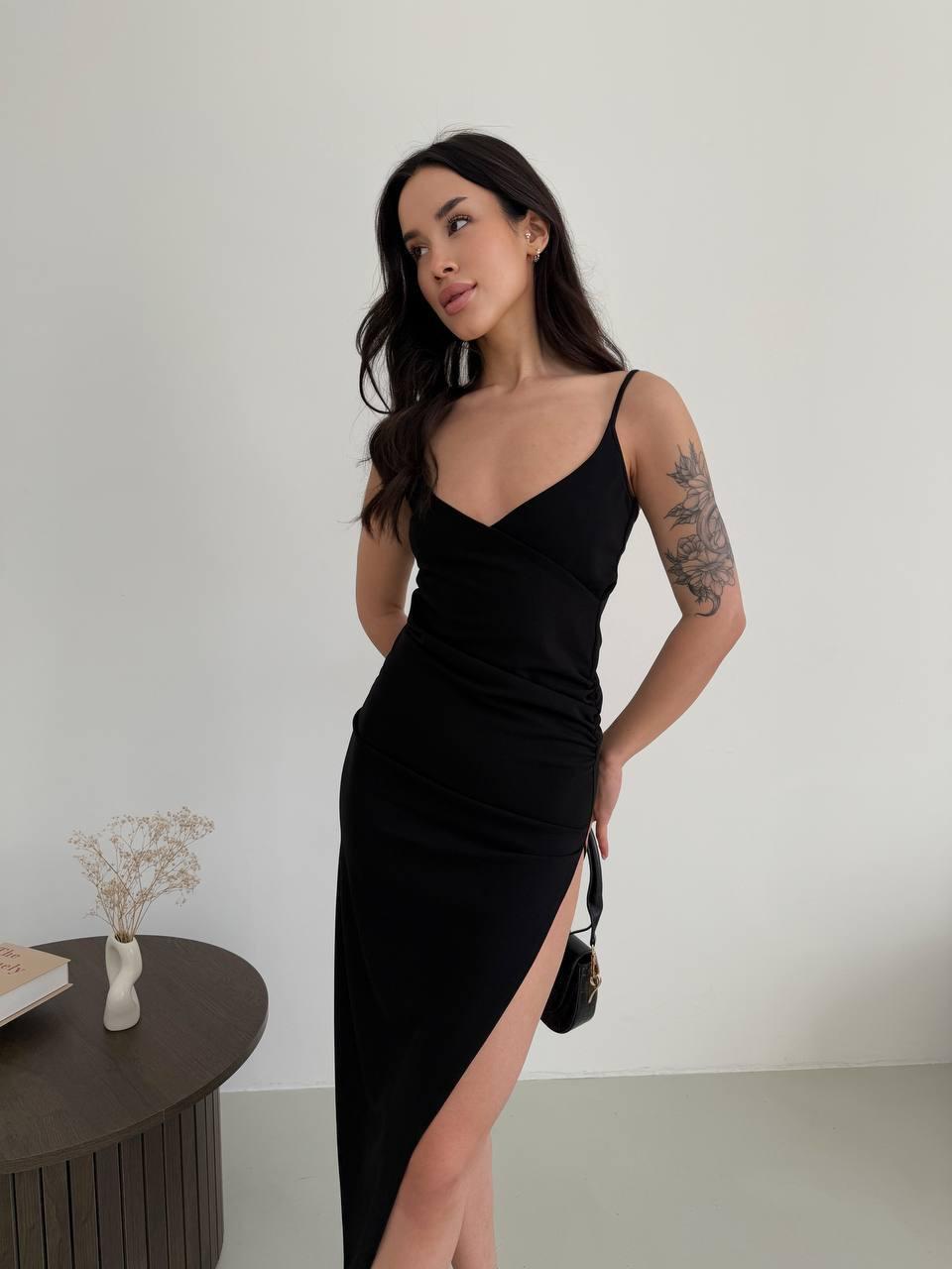 Вечірня чорна міді сукня на тонких бретелях із розрізом на нозі та вирізом декольте (р. 42-48)